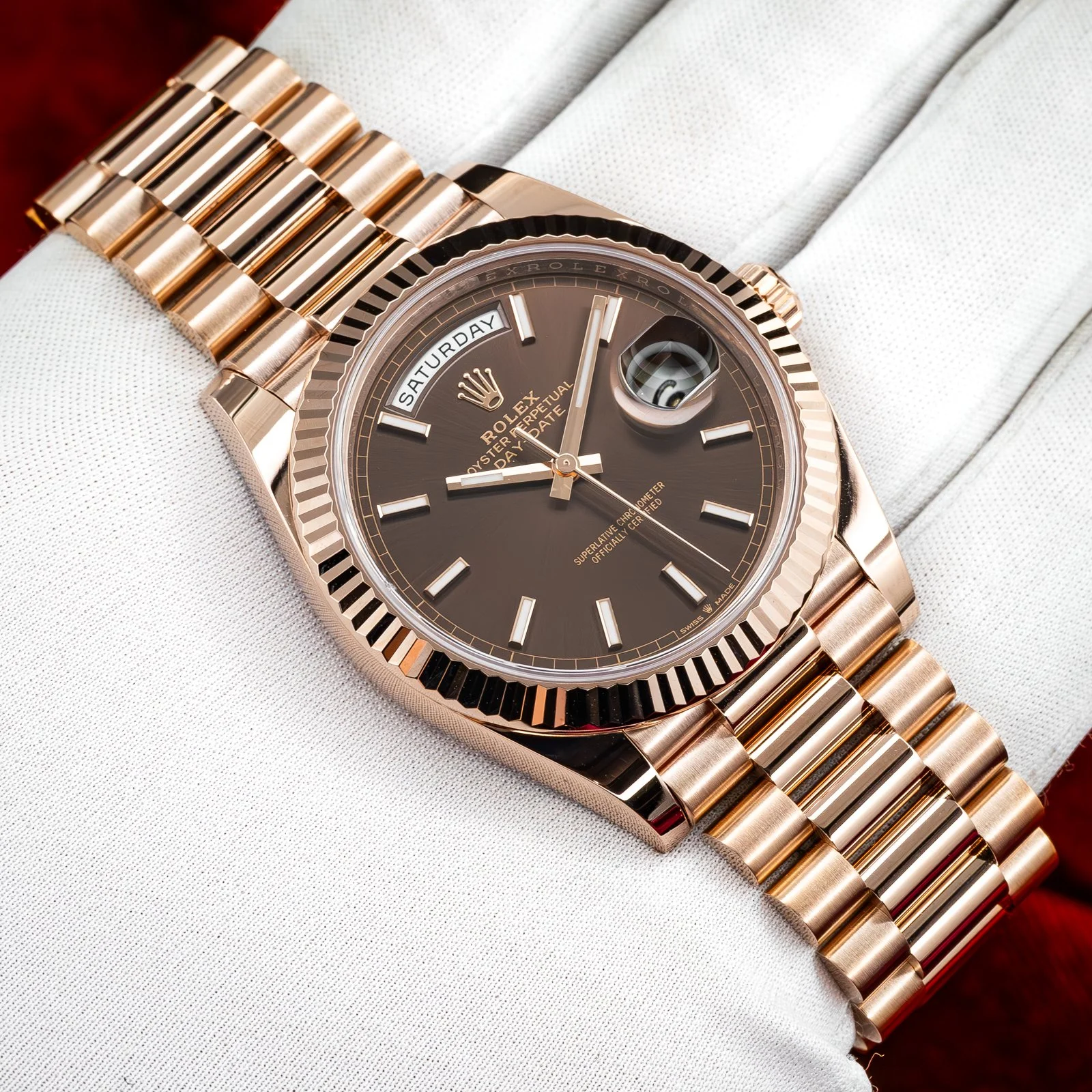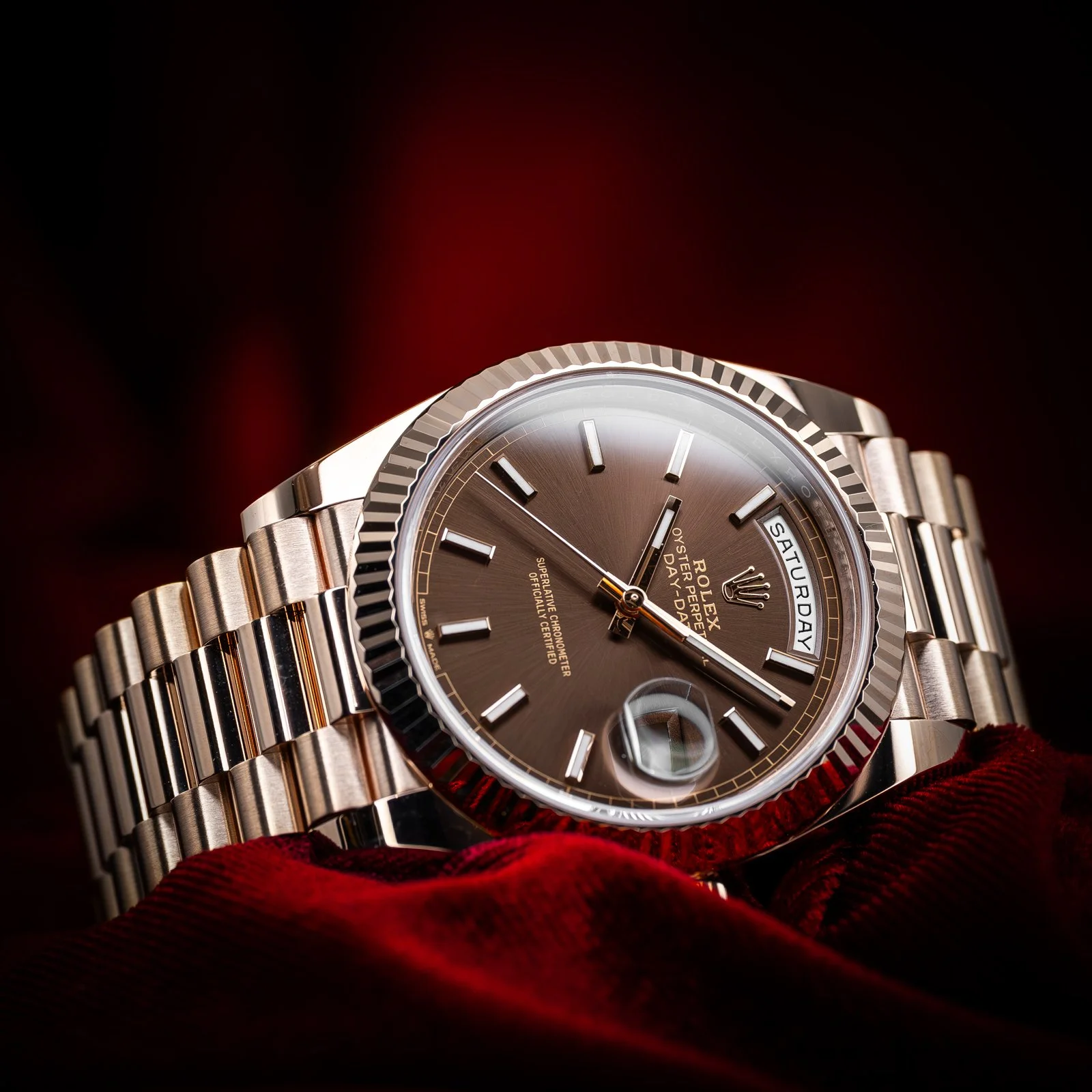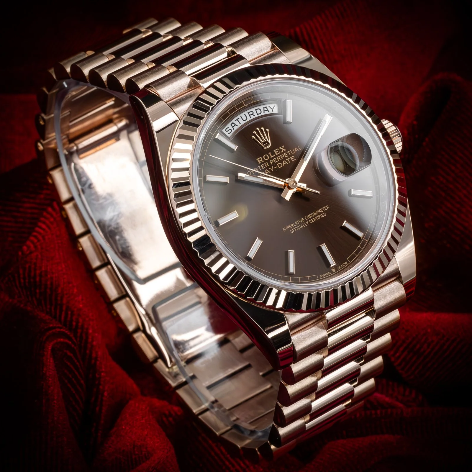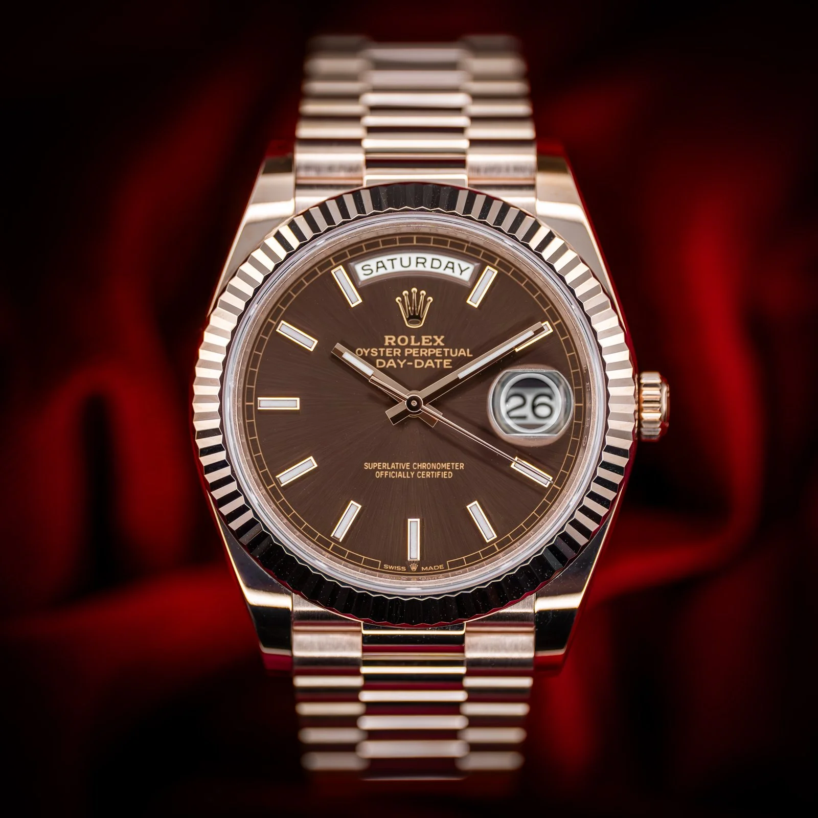 The Rolex Day-Date in Everose gold with its rich chocolate dial is pure luxury on the wrist. Crafted from Rolex’s signature 18k Everose gold, this masterpiece radiates warmth and elegance. The sunray chocolate dial glows with depth, beautifully complemented by Roman numeral markers that give it a timeless, classic style.