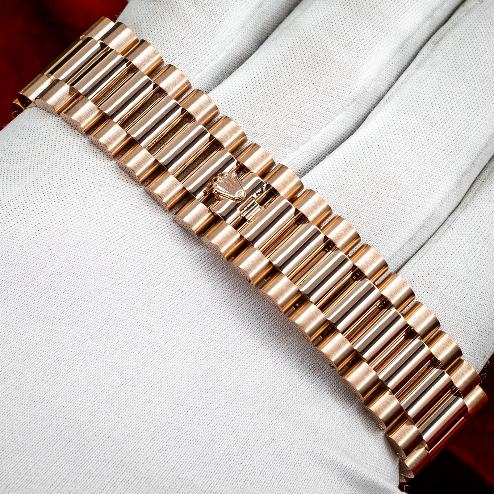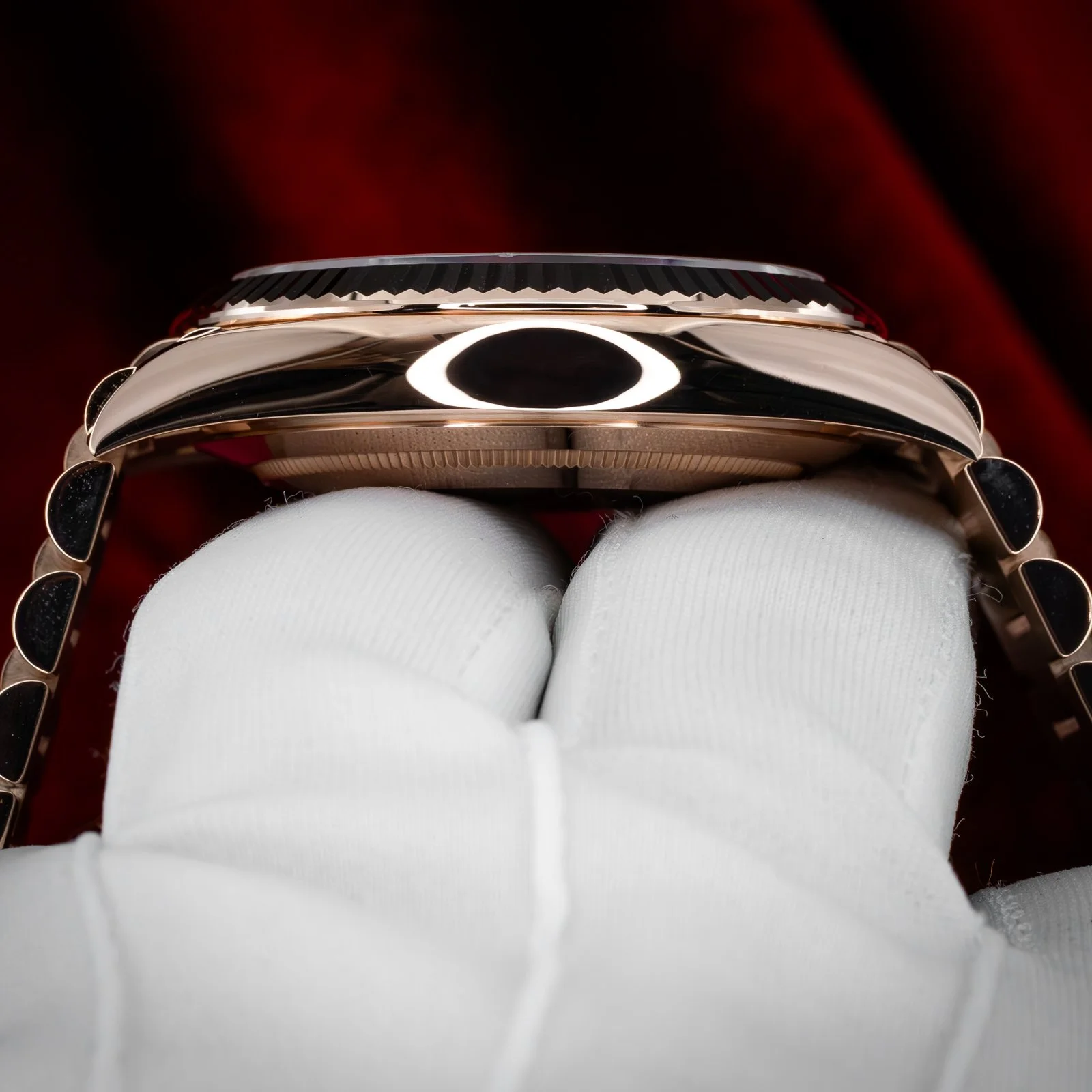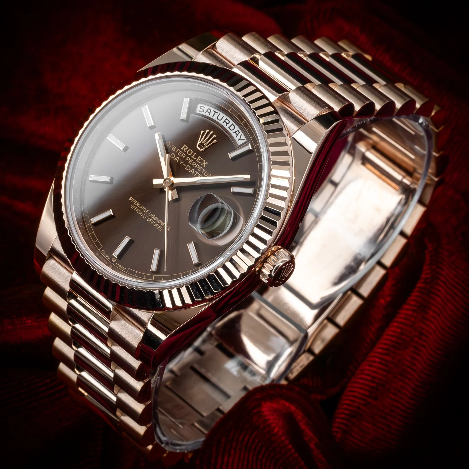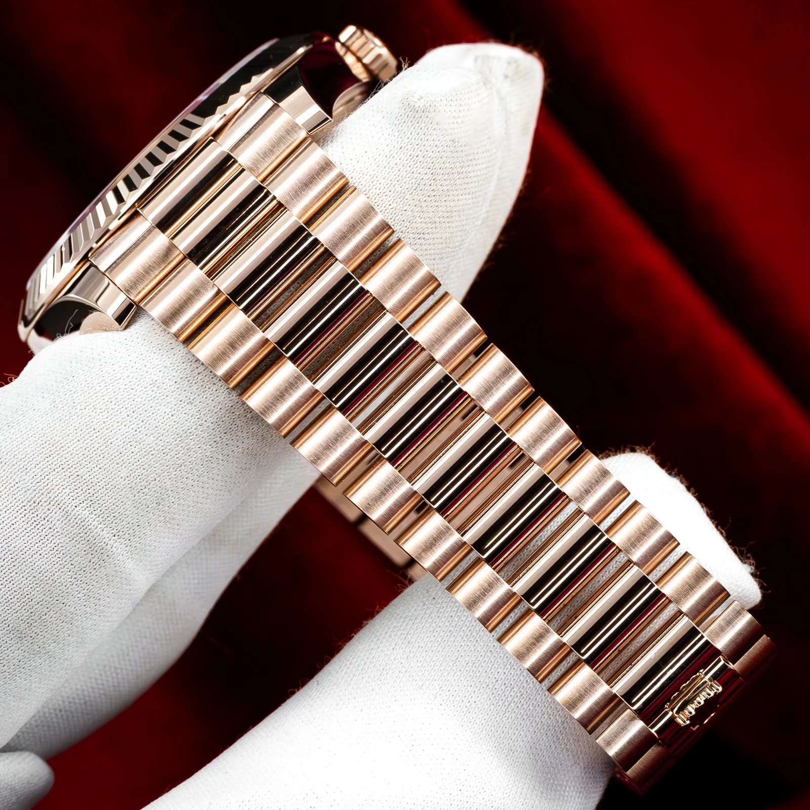 The Rolex Day-Date in Everose gold with its rich chocolate dial is pure luxury on the wrist. Crafted from Rolex’s signature 18k Everose gold, this masterpiece radiates warmth and elegance. The sunray chocolate dial glows with depth, beautifully complemented by Roman numeral markers that give it a timeless, classic style.
