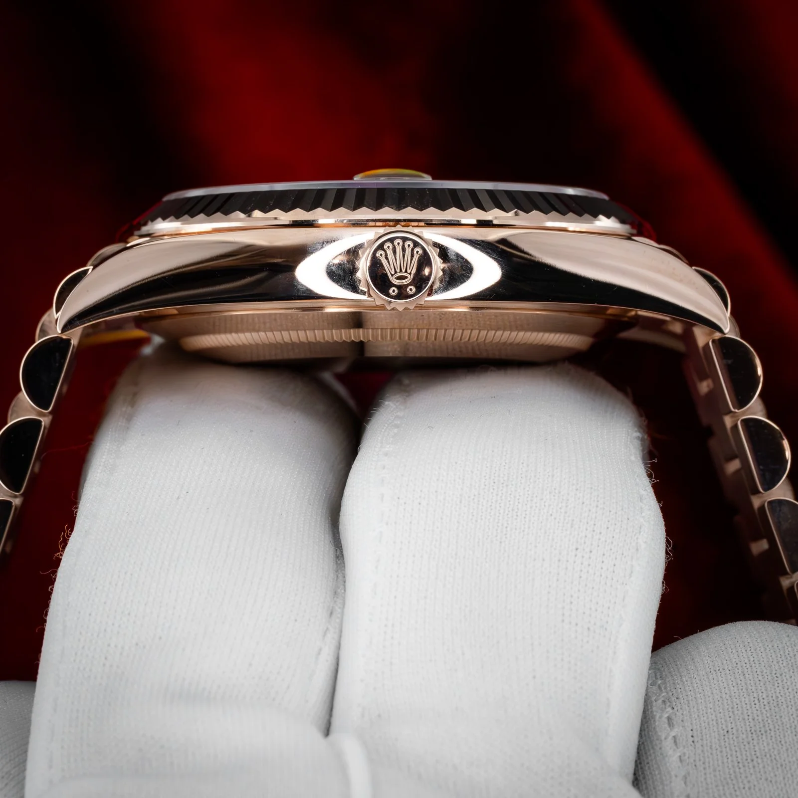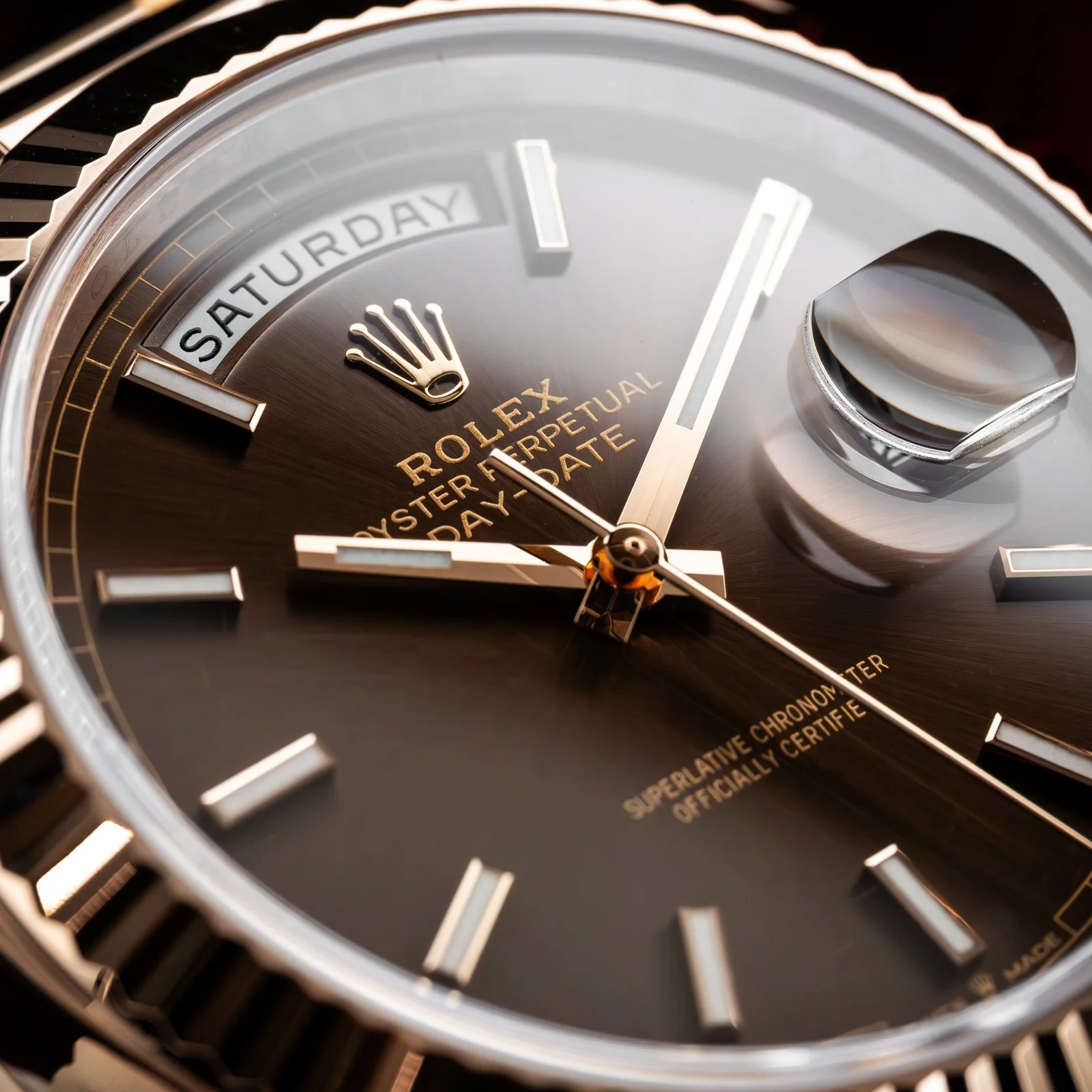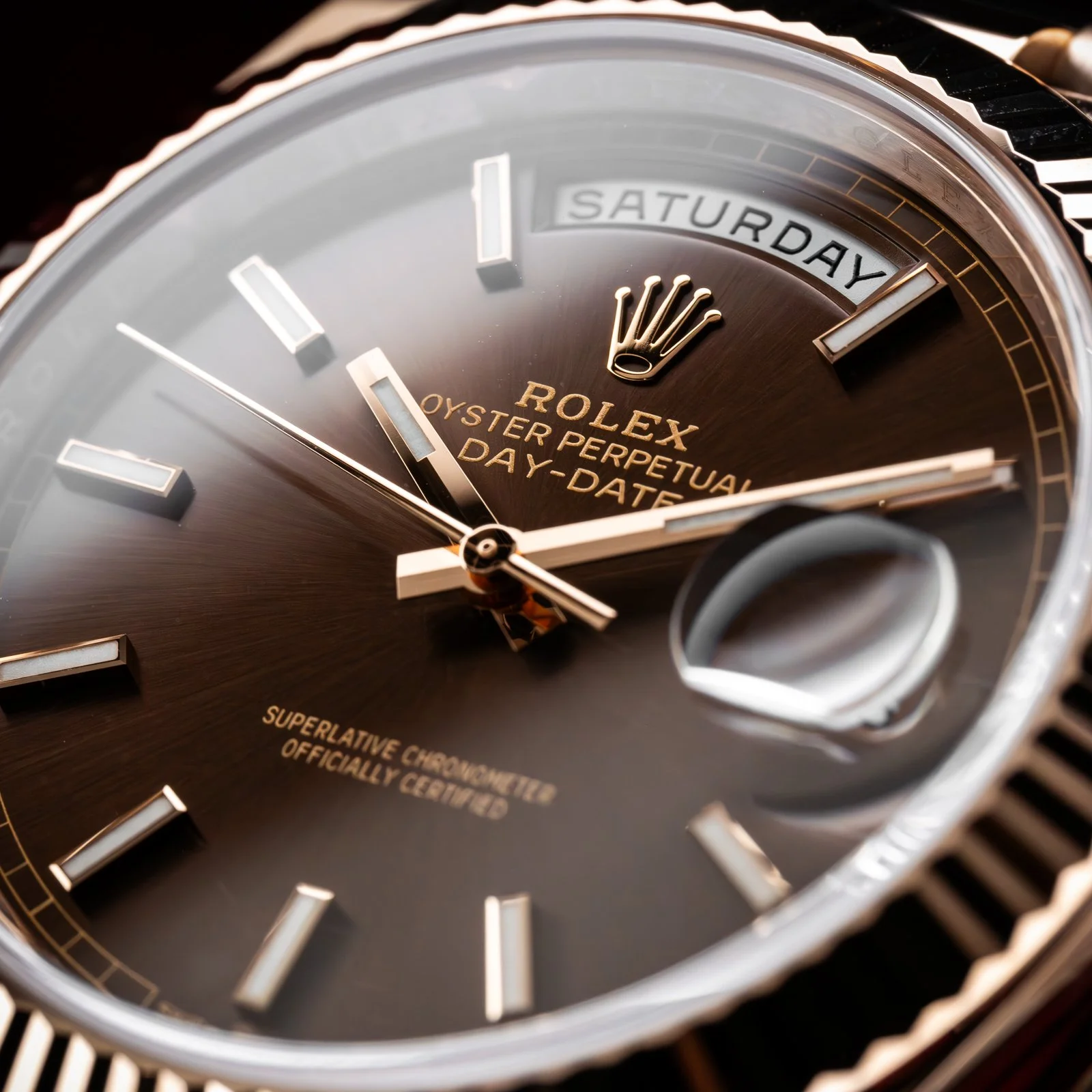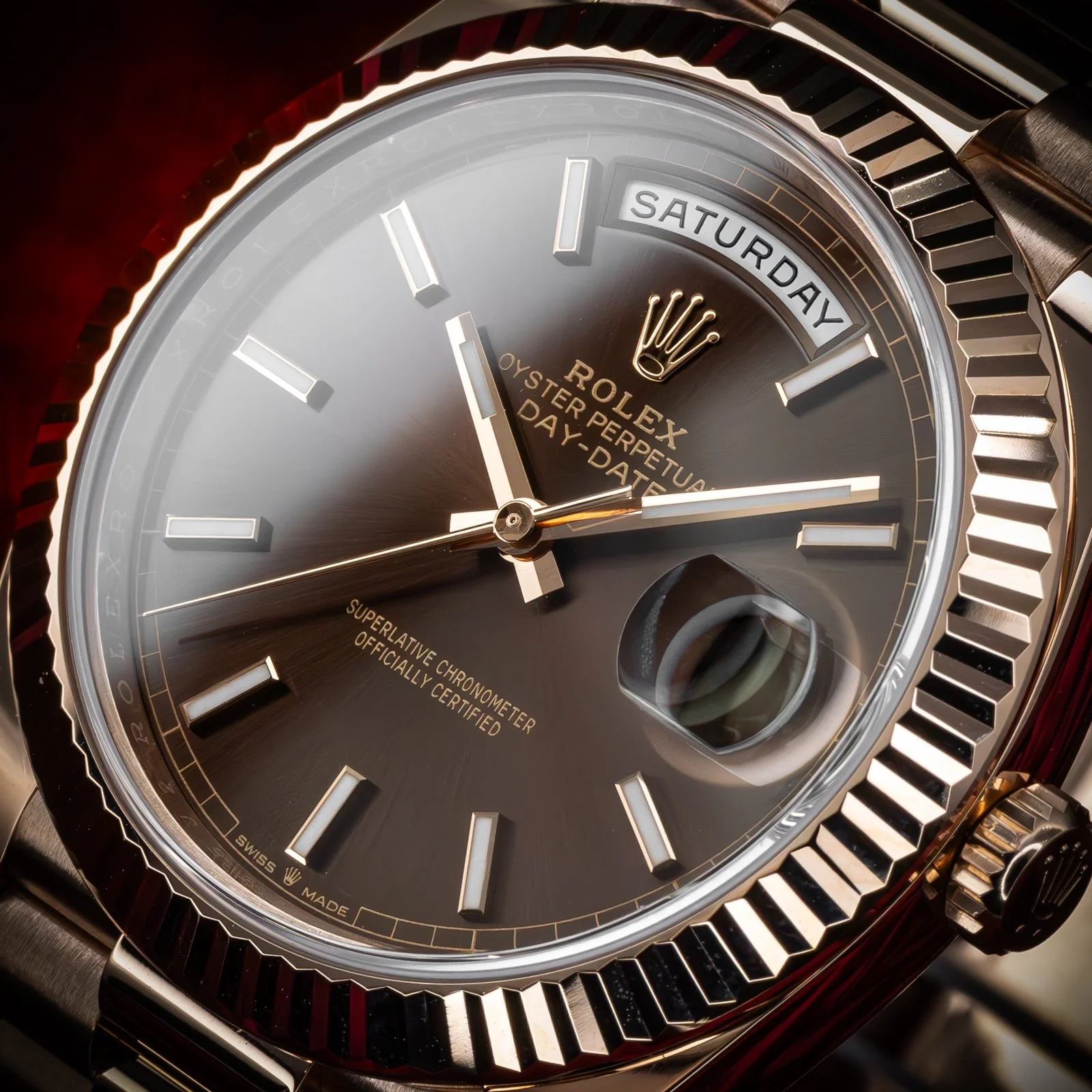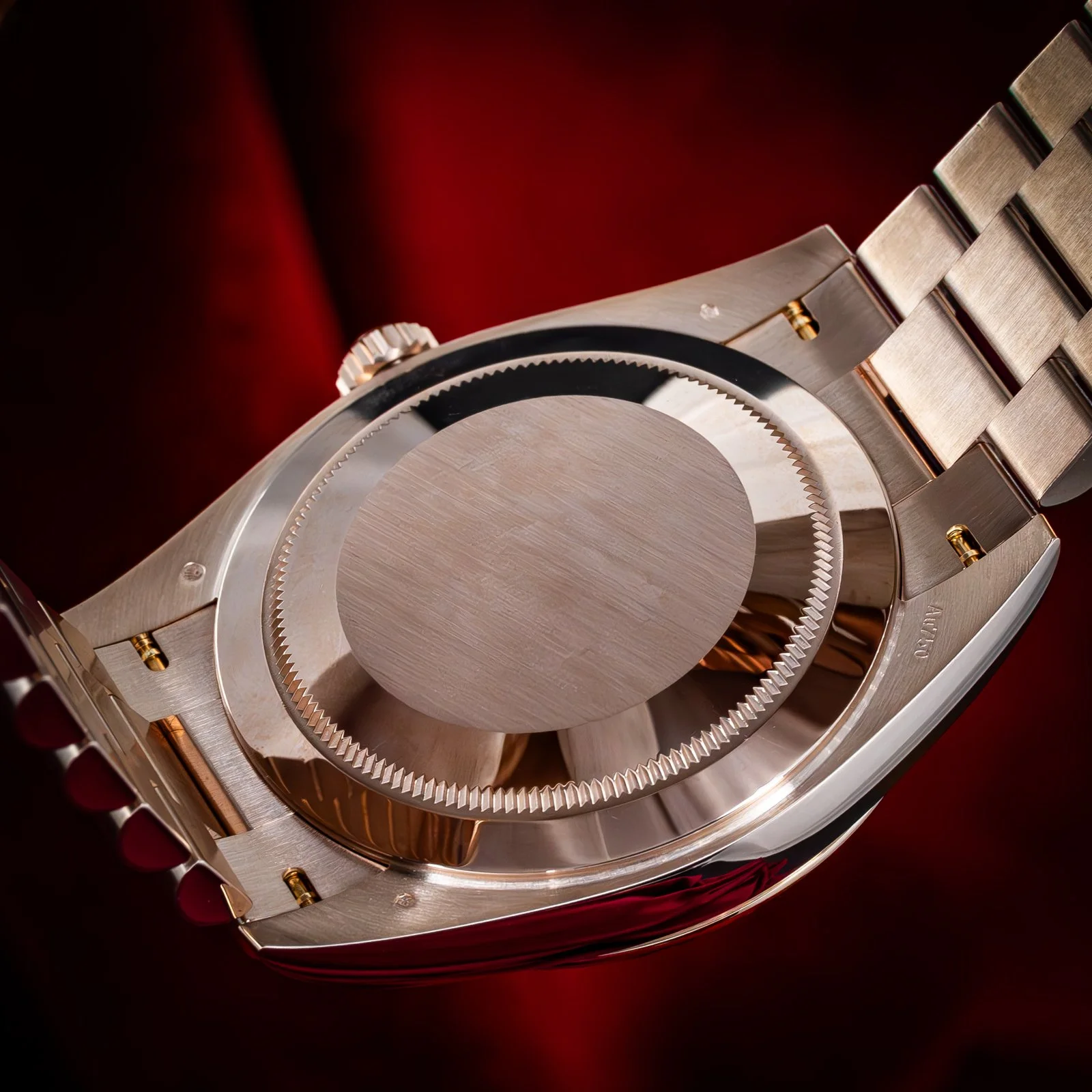 The Rolex Day-Date in Everose gold with its rich chocolate dial is pure luxury on the wrist. Crafted from Rolex’s signature 18k Everose gold, this masterpiece radiates warmth and elegance. The sunray chocolate dial glows with depth, beautifully complemented by Roman numeral markers that give it a timeless, classic style.