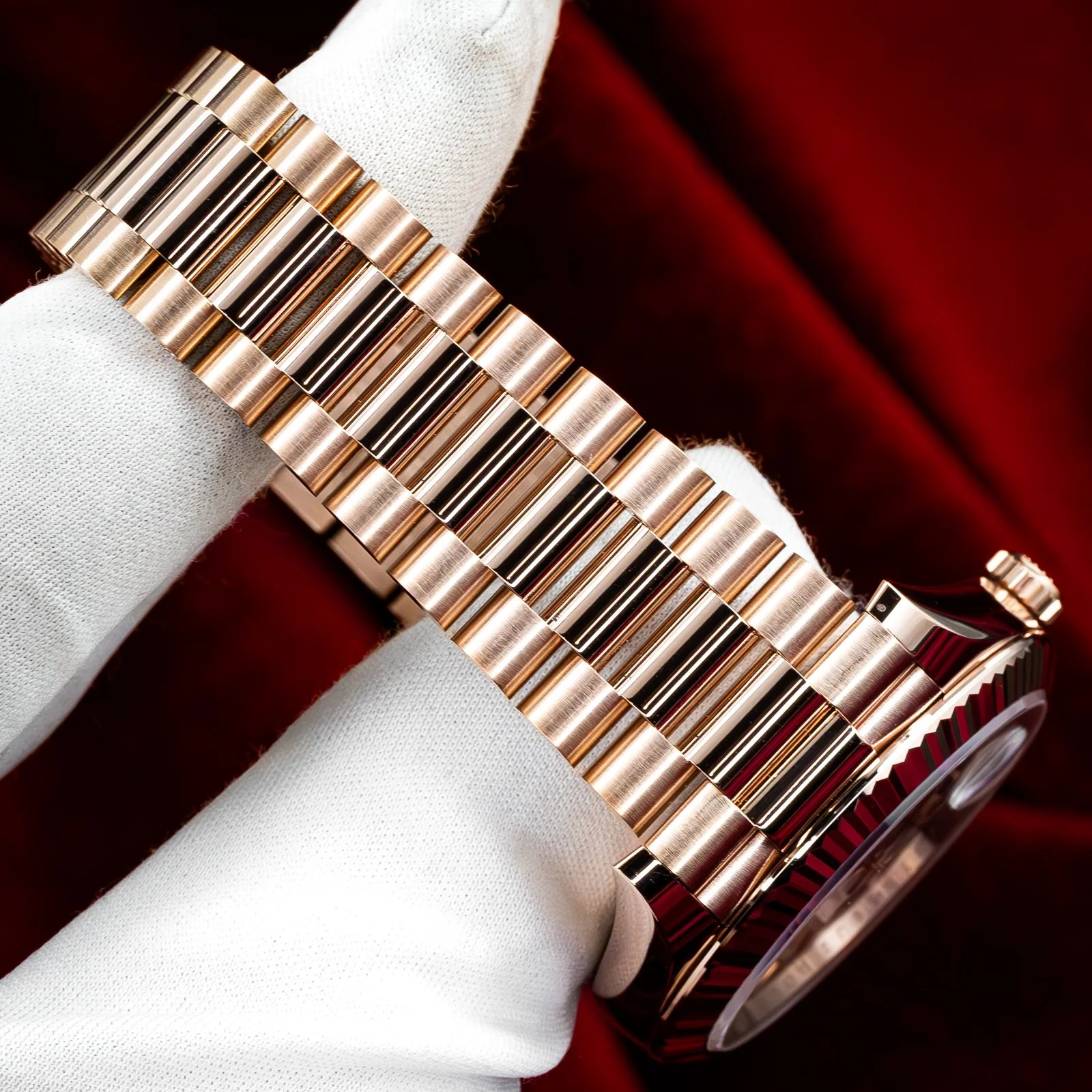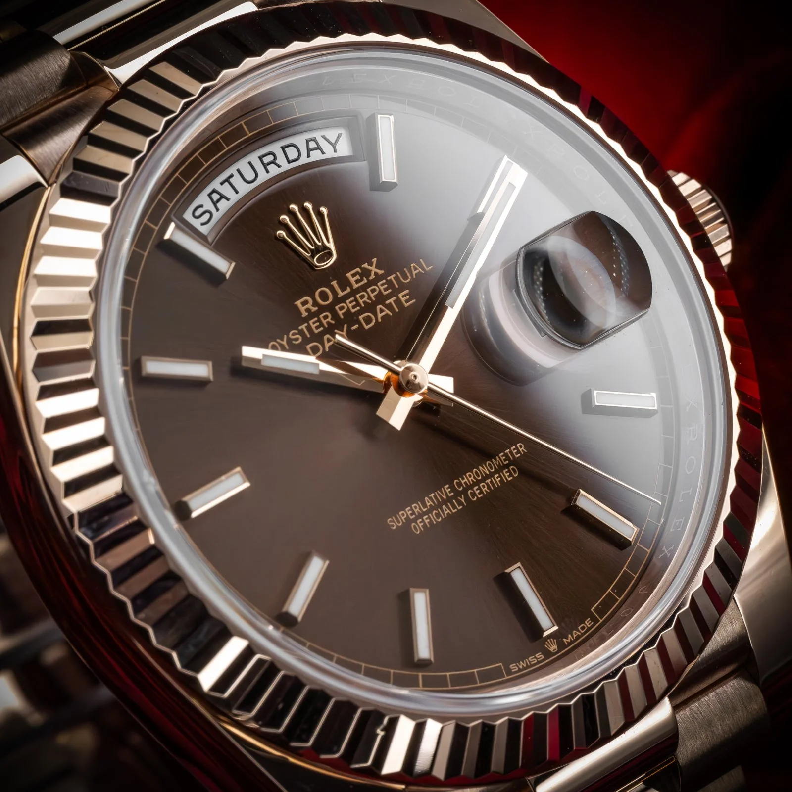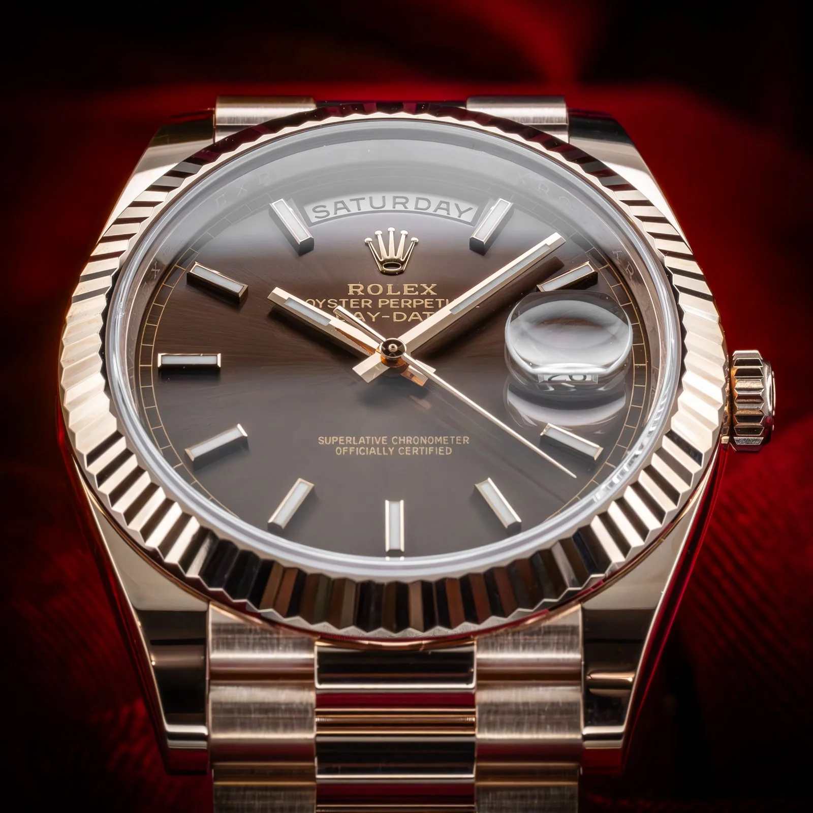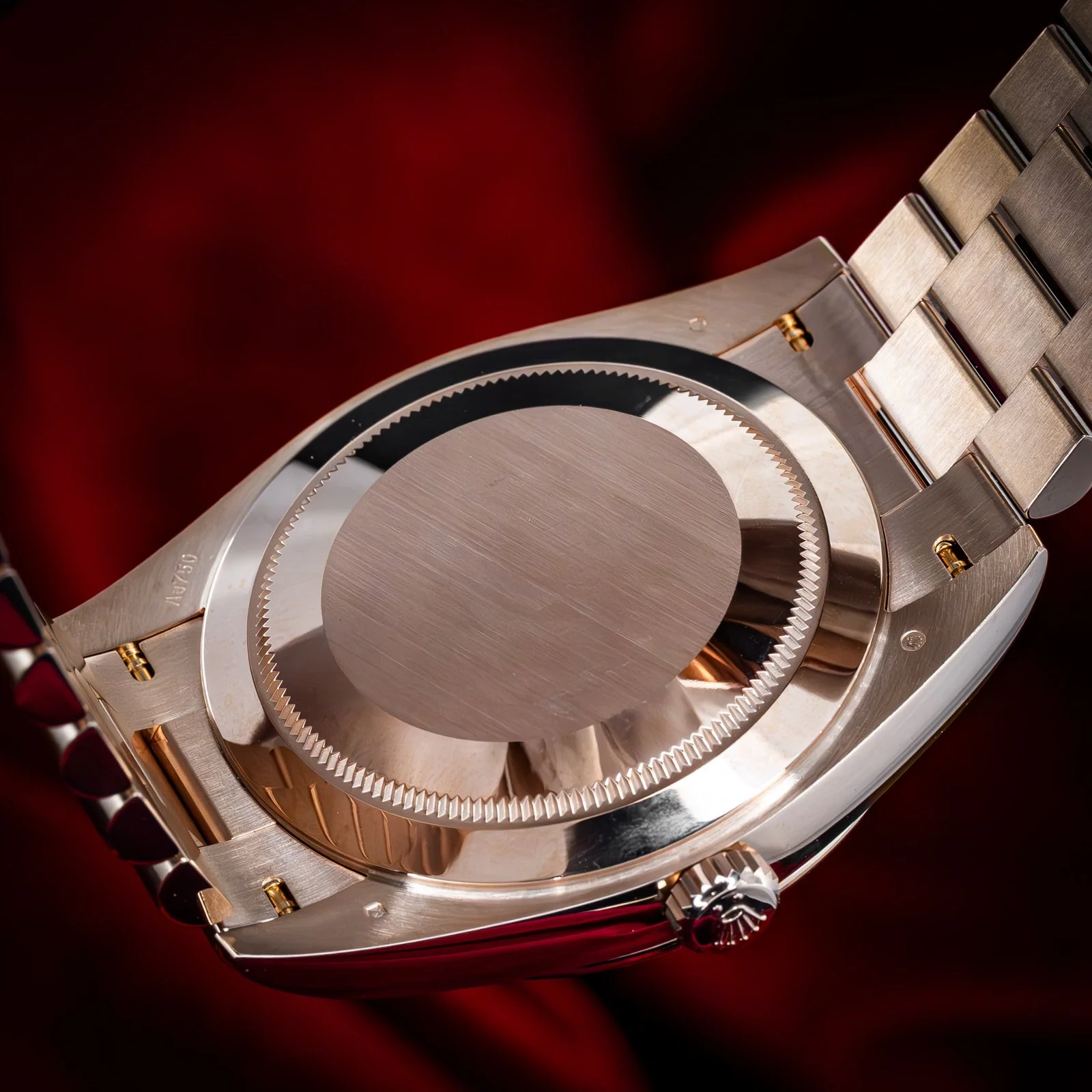 The Rolex Day-Date in Everose gold with its rich chocolate dial is pure luxury on the wrist. Crafted from Rolex’s signature 18k Everose gold, this masterpiece radiates warmth and elegance. The sunray chocolate dial glows with depth, beautifully complemented by Roman numeral markers that give it a timeless, classic style.