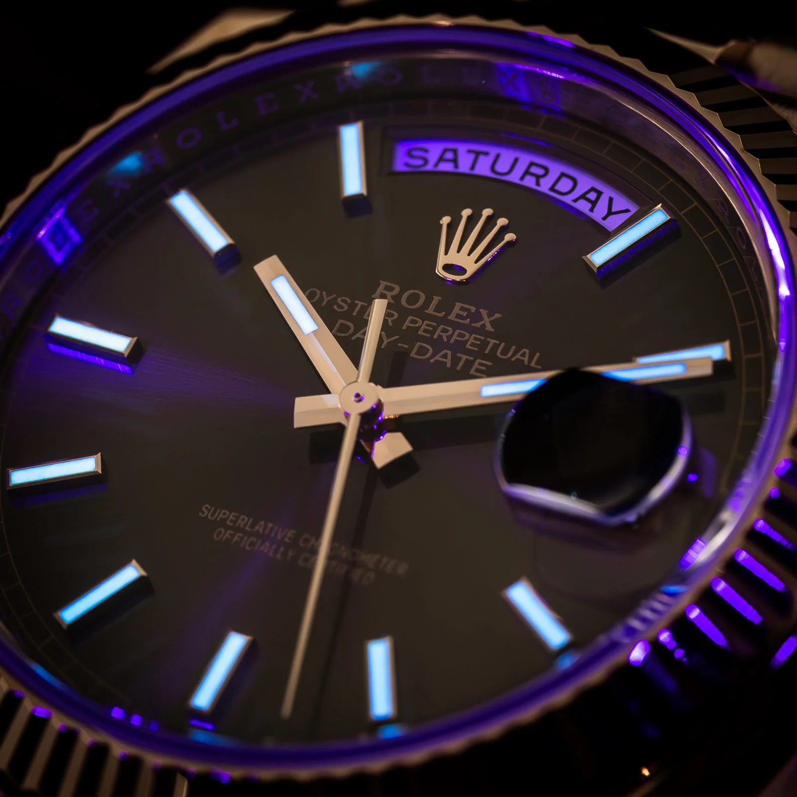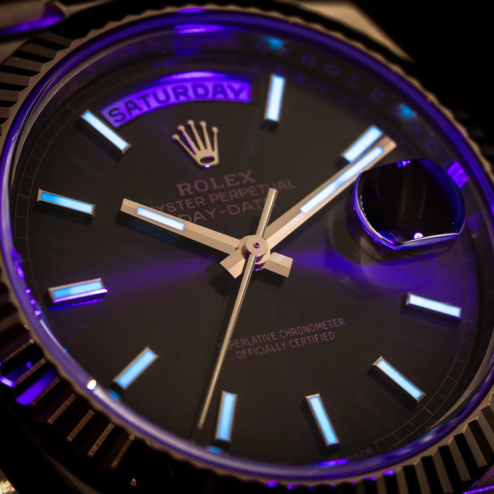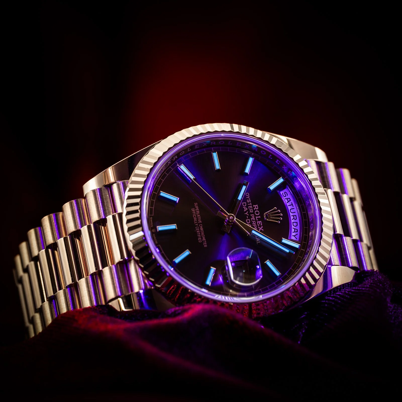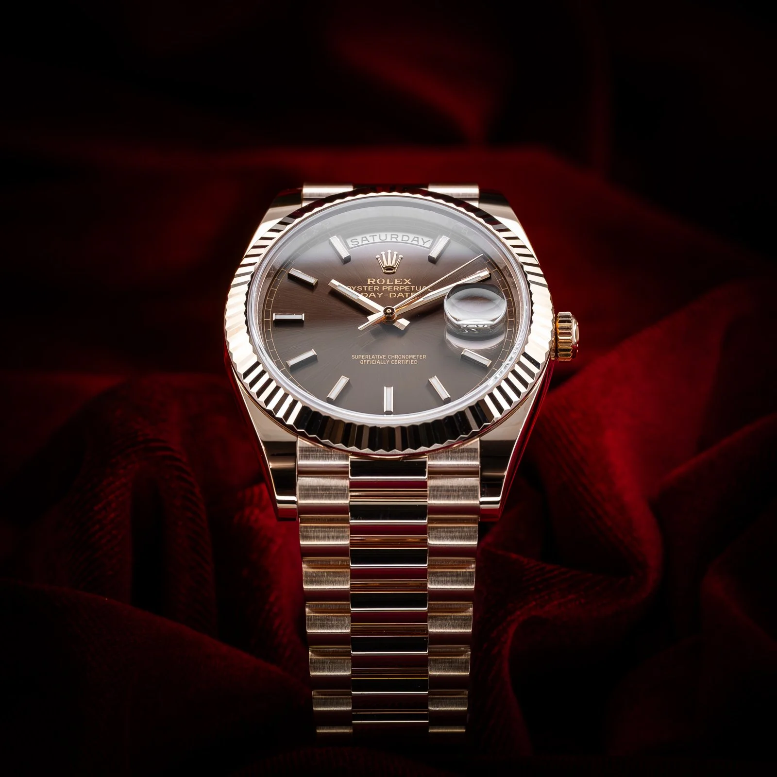 The Rolex Day-Date in Everose gold with its rich chocolate dial is pure luxury on the wrist. Crafted from Rolex’s signature 18k Everose gold, this masterpiece radiates warmth and elegance. The sunray chocolate dial glows with depth, beautifully complemented by Roman numeral markers that give it a timeless, classic style.